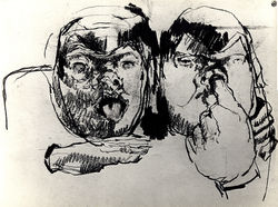 In die eerste tekeningen zie je dat hij zelden een eenduidig beeld tekent. De tekening van een man in een stoel keurig in pak, vertoont in het midden het beeld van een gedeelte van een vrouw. Bij portretten en face tekende hij tegelijkertijd het profiel, soms met meerdere ogen er omheen. Bij zijn ‘Zelfportret voor Dierbaren’ is het hele tekenpapier gevuld met fragmenten van zijn gezicht of verschillende uitdrukkingen van zijn gezicht. Als hij de voorkant van iets tekende wilde hij tegelijkertijd de achterkant